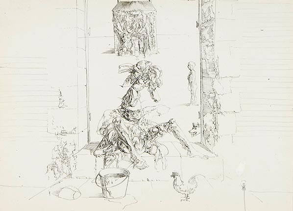 Dado: I’ve been drawing practically every day now for two and a half years, especially when the light is fading, as evening is drawing in, or at wintertime. After the graft of a large oil painting, pen-and-ink drawing was supposed to offer a kind of rest – or at least a means of escaping painting, so as to return to it with fresh eyes. In fact, it is as hard to get out of a good drawing as it is out of a good picture, and there was no question of rest, because to do anything requires tension. There is great collusion, I think, between my pictures and my drawings. They follow a different pace, but each is as hard and as painstaking as the other. Sometimes I felt that painting started to appear too much in my drawing – when the drawings became too liquid, too modeled – and immediately I had to stop and start again.